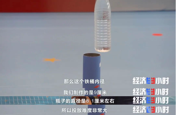 无人机精准抛投项目,是完全模拟水上抛投救援的场景。要求选手首先操作悬挂矿泉水瓶的无人机飞至铁筒上方,将矿泉水瓶精准地投放至铁筒内。这个项目非常考验选手操控的稳定性。