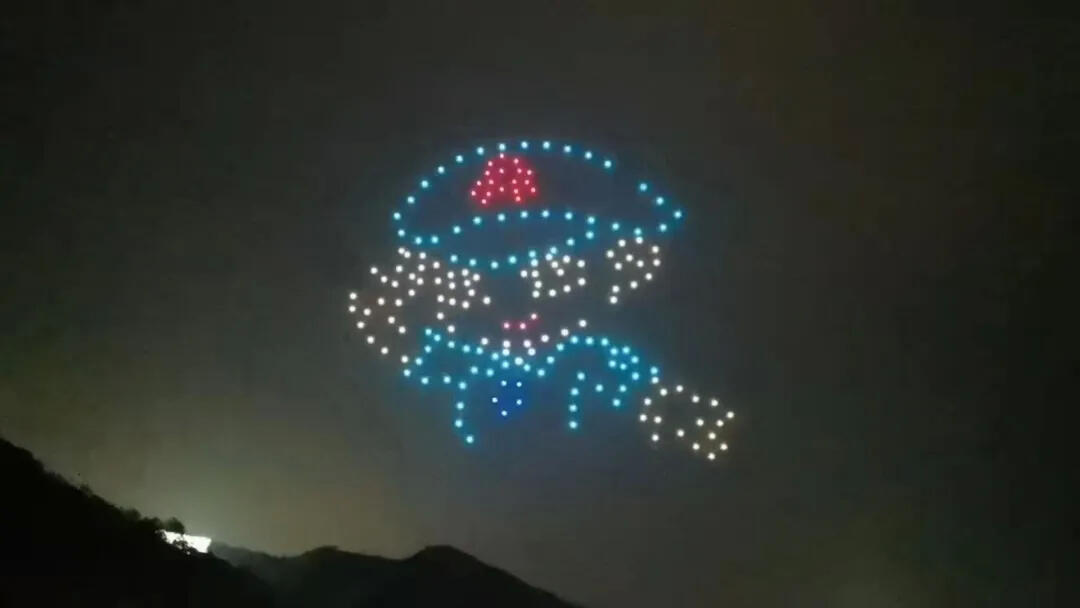 无人机方阵起飞,在空中组成多种图案,向中国人民警察节致以崇高敬意。