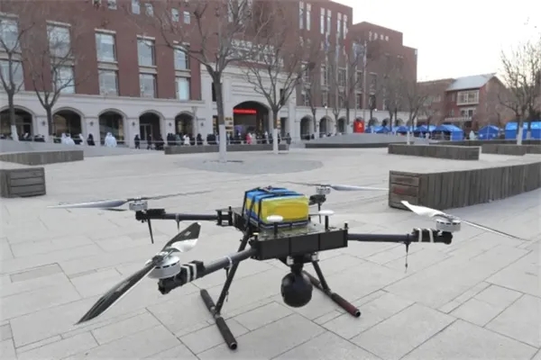“准备就绪,即将起飞!”9时左右,一架装载着口罩、手套、暖手宝等防疫物资的无人机从天津滨海—中关村协同创新示范基地前广场缓缓起飞,随后精准降落在顶益食品检测点位现场,现场工作人员随即上前将无人机运送到物资取出,分发给医护人员。