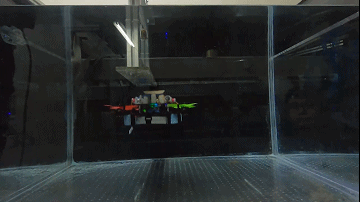 接着,小组研制了能在空中和水下使用的无人机,并在其上配置了吸盘,它可以吸附在潮湿或者干燥的平面或曲面上。在泳池的水下测试中,它能吸附到更大的水下机器人上,并且可以脱离。吸附状态下,螺旋桨可以完全断电。