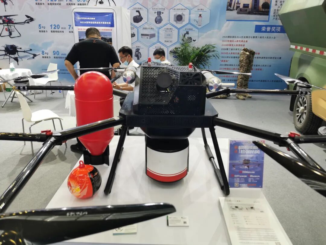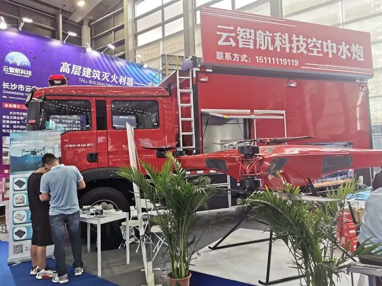 云智航“空中水炮”是一款公司所研发的系留式大载重多旋翼,通过地面高压水泵大载重无人机平台承戴水枪、水管飞往高层起火处直接喷洒灭火,系留供电方式能够保证灭火无人机持续飞行作业。无人机搭载水带以3米/秒的速度快速升空,抵达近高层火源处持续喷洒灭火水剂直到火源扑灭。